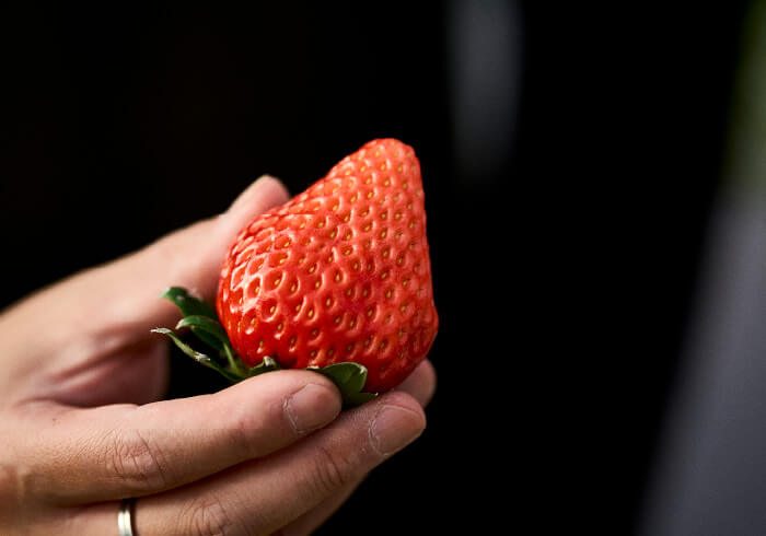 円錐形の果実で大きさは中程度。光沢のある濃紅色の果皮に、濃い赤色の果肉。高い糖度の甘さと控えめな酸味、そして香りが調和した豊かな味わいの苺です。