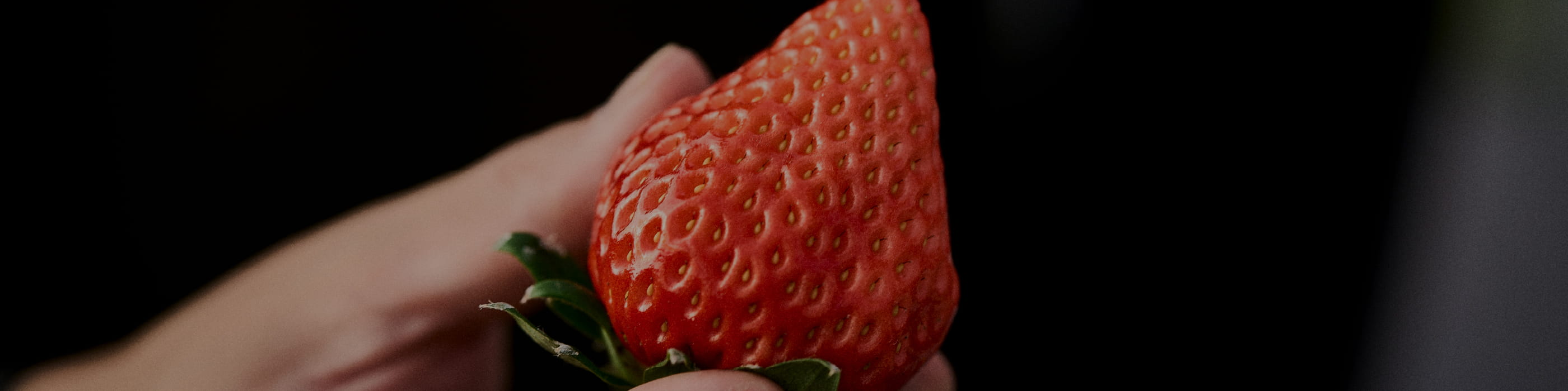 円錐形の果実で大きさは中程度。光沢のある濃紅色の果皮に、濃い赤色の果肉。高い糖度の甘さと控えめな酸味、そして香りが調和した豊かな味わいの苺です。